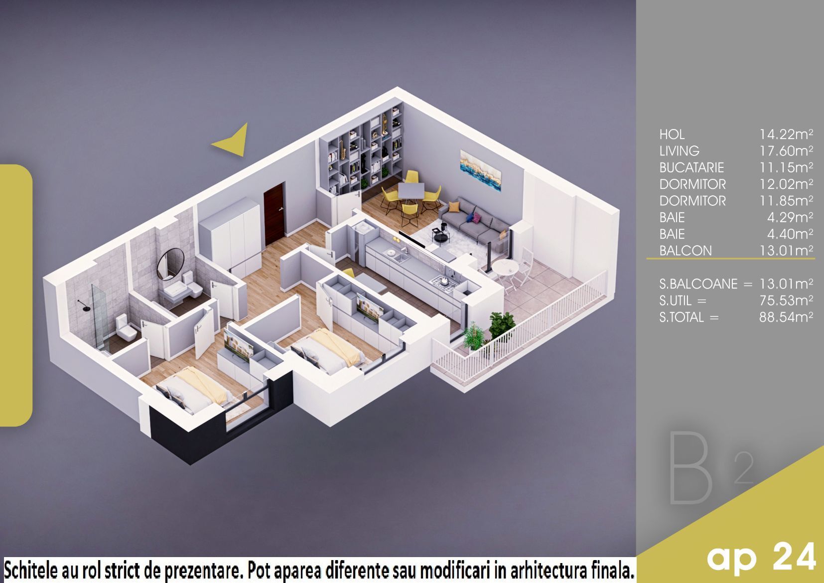 Apartamentul este decomandat si are o suprafata totala de 88.54 mp. Acesta este alcatuit dintr-o camera de zi, doua dormitoare, o bucatarie, doua bai, un hol si un balcon, cu acces din camera de zi si bucatarie.