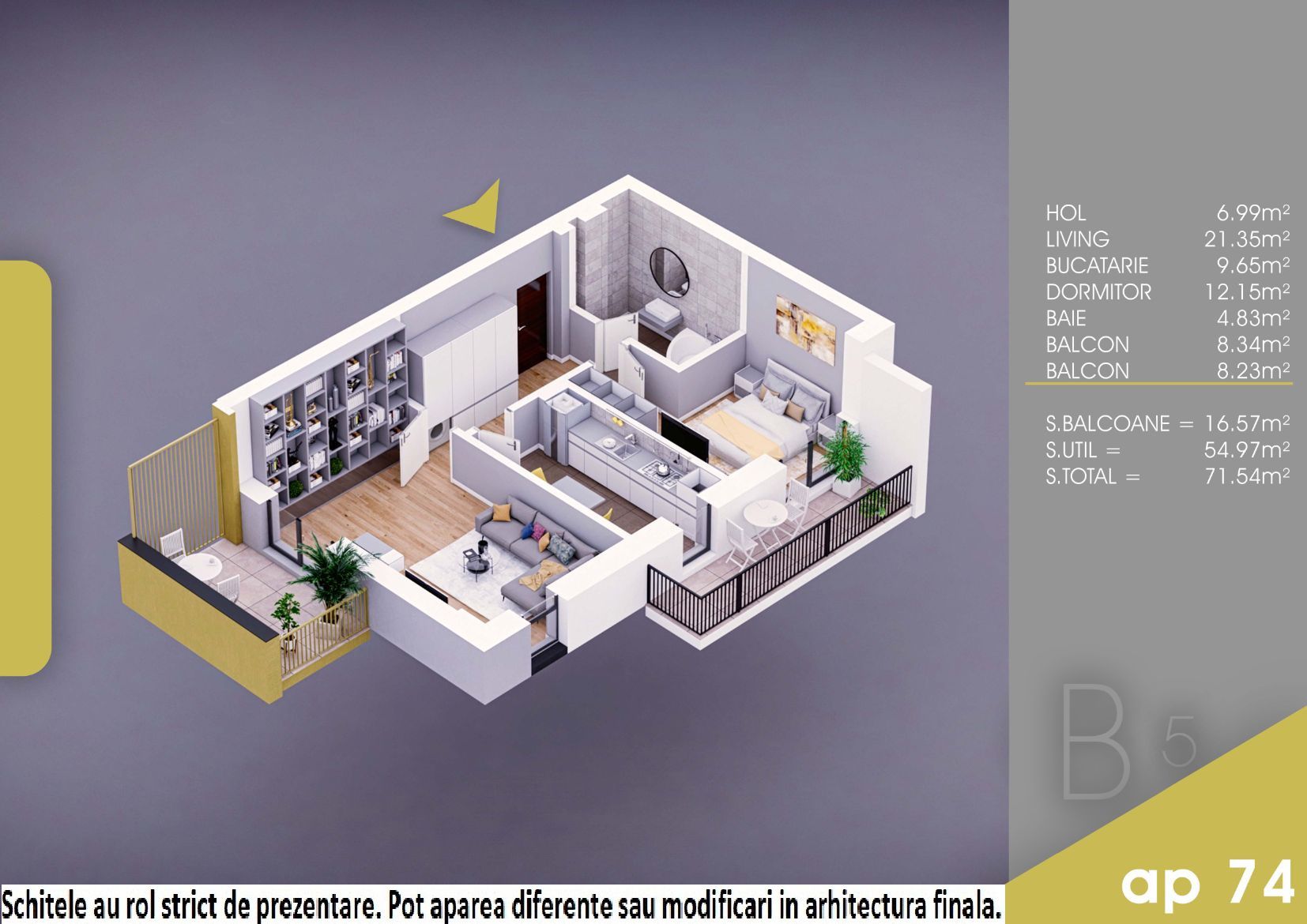 Apartamentul este decomandat si are o suprafata totala de 71.54 mp. Acesta este alcatuit dintr-o camera de zi, un dormitor, o bucatarie, o baie, un hol si doua balcoane.