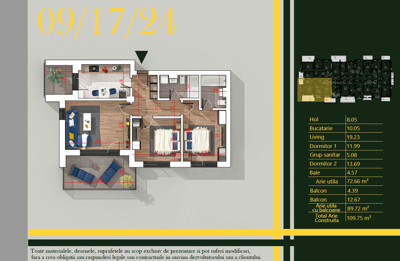Apartamentul este decomandat si are o suprafata totala de 89.72 mp. Acesta este alcatuit dintr-o camera de zi, doua dormitoare, o bucatarie, doua bai, un hol, doua balcoane cu acces atat din camera de zi cat si din bucatarie.